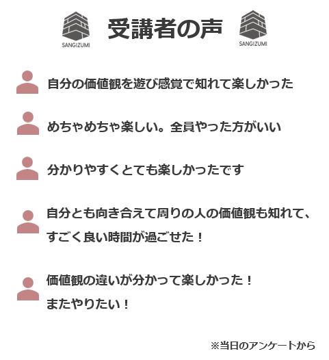 受講者の皆様の自己理解や今後のアクションにつながれば幸いです。さんぎづみにとっても、新たな気づきとご縁を積み重ねられた貴重な経験となりました。また、私どもも二日間とても楽しく過ごせました。